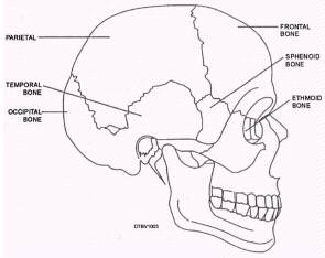 Figure 3-3.\Cranial bones. The zygomatic process of the temporal bone projects out into the zygomatic bone of the face and forms the lateral part of the zygomatic arch. Both the glenoid fossae and zygomatic process can be seen in figure 3-4. |