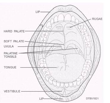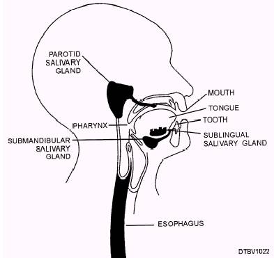 allowing food to enter the nasal cavity. The soft palate must function properly to allow good speech quality. Located in the posterior part of the mouth, on both sides of the tongue, are two masses of lymphatic tissue called the palatine tonsils. They assist the body to protect against infections. TEETH The teeth are located in the alveolar process of the maxillae and the mandible. They serve important functions of tearing and masticating food, assisting in swallowing, speaking, and in appearance. The health of the teeth affects the health of the entire body. SALIVARY GLANDS The functions of the three major salivary glands are to keep the lining of our mouths moist, and to bond with food particles creating a lubricant effect that assists in the swallowing process of food. It acts as a cleaning agent to wash away food particles that accumulate in the mouth and on the teeth. Figure 3-22 illustrates the salivary glands. The salivary glands produce two to three pints of saliva daily, which greatly aids in the digestion process. Enzymes are present in saliva, they act on food, and start the breakdown process. In dentistry, knowing exactly where the saliva glands and ducts (openings) are located is important in keeping the mouth dry