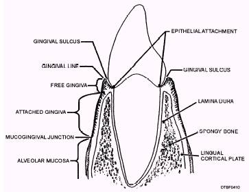 Figure 4-10.\Structures of the gingiva. portion is approximately 1 to 3 mm wide and forms the soft tissue wall of the gingival sulcus next to the tooth. Other structures of unattached gingiva include: Gingival margin\The 1 mm narrow band of gingiva that forms the immediate collar around the base of the tooth. This area is first to show symptoms of gingivitis. Gingival sulcus\Area between the unattached gingiva and the tooth. Popcorn hulls get trapped in this area. Epithelial attachment\Joins the gingiva to the tooth surface. Interdental papilla\The portion of the free gingiva that fills the interproximal embrasures below the contact areas of adjacent teeth. It helps prevent food from packing between the teeth. Attached Gingiva.\Located apical to the free gingiva on the labial and lingual aspects. It is firmly fixed to the underlying bone of the cortical plates of the alveolar process. Mucogingival Junction.-A line that separates the attached gingiva from the lining mucosa. Lining Mucosa Lining mucosa is found on the inside of the lips, cheeks, vestibule, soft palate, and under the tongue. It consists of a thin, fragile tissue that is very vascular. Lining mucosa is brighter red in color than masticatory mucosa. Also included in the lining mucosa is alveolar mucosa. It lies apical to the mucogingival junction and is loosely attached. TOOTH MORPHOLOGY This section describes the external features of the teeth. A tooth is defined as "one of the hard, bony appendages that are borne on the jaws...and serve for the seizing and mastication of food, as weapons of offense and defense, etc." In man and the lower animals, the design of the teeth are a reflection of eating habits. Animals, classified according to their eating habits, are carnivorous (flesh eating), herbivorous (plant eating), or omnivorous (eating everything; both flesh and plant). |