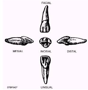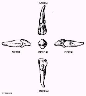 Figure 4-27.\Surfaces of a maxillary central incisor. Lingual Surface\The lingual surface (fig. 4-28) is quite similar to the facial surface in outline except that it is slightly smaller in all dimensions. At the mesial and distal margins there are marginal ridges. Occasionally there is a cingulum at the junction of the lingual surface with the cervical line. Sometimes a deep pit, the lingual pit, is found in conjunction with a cingulum. Root Surface\As with all anterior teeth, the root of the maxillary central incisor is single. This root is from one and one-fourth to one and one-half times the length of the crown. Usually, the apex of the root is inclined slightly distally. MAXILLARY LATERAL INCISORS The maxillary lateral incisor (tooth #7 or #IO),