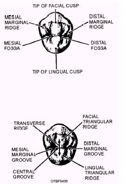 Figure 4-36.\Features of an occlusal surface of maxillary first bicuspid. cusps.") Sometimes bicuspids are called premolars because they are just in front of the molar teeth. Facial Surface\The facial surface is somewhat similar to the facial surface of the cuspid. However, the tip of the facial cusp is located in the center of the "biting" edge, which is called the occlusal edge or occlusal margin. From the cusp tip to the cervical margin, there is a slight ridge, called the facial ridge, similar to the facial ridge found in cuspid teeth. Lingual Surface\The lingual surface is narrower and shorter than the facial surface, and is smoothly convex in all directions. The cusp tip is in the middle of the occlusal edge. Root Surface\The root is quite flat on the mesial and distal surfaces. In about 50 percent of maxillary first bicuspids, the root is divided in the apical third, and when it so divided, the tips of the facial and lingual roots are slender and finely tapered. Occlusal Surface\The occlusal surface (fig. 4-36) has a facial cusp and a lingual cusp. There are mesial and distal marginal ridges. Two fossae are on the occlusal surface-the mesial and distal fossae. MAXILLARY SECOND BICUSPID The maxillary second bicuspid (tooth #4 or #13), illustrated in figure 4-37, resembles the first bicuspid very closely, but is smaller in dimensions. The cusps are not as sharp as the maxillary first bicuspid and have only one root. MANDIBULAR FIRST BICUSPID The mandibular first bicuspid (tooth #21 or #28), illustrated in figure 4-38, is the fourth tooth from the midline. It is the smallest of the four bicuspids. The term bell-crowned is used to describe its appearance. The mandibular first bicuspid has many characteristics of a cuspid. Occlusal Surface\A large facial cusp, which is long and well defined, and a small nonfunctional lingual cusp are present on the mandibular first bicuspid. Root Surface\The root of the mandibular first bicuspid is usually single, but on occasion can be bifurcated (two roots).