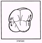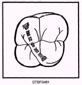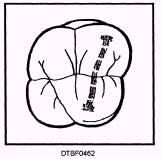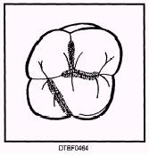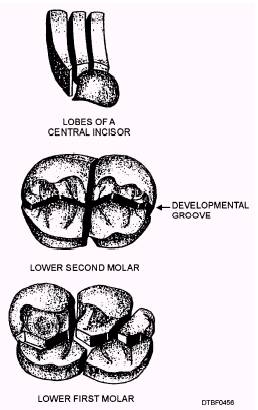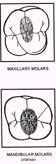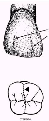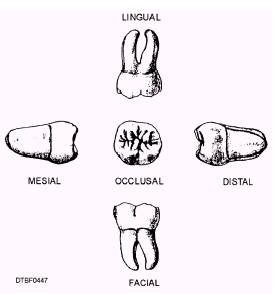 Figure 4-47.\Surfaces of mandibular third molar. size found on the surface of a tooth. Central fossa\Centrally located depression found on the occlusal surface of molars and mandibular second bicuspids. The other bicuspids have mesial and distal triangular fossa, but do not have a central fossa.