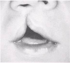Figure 5-1.\Cleft lip of an infant. \Neglect: Result of the lack of proper oral hygiene. MICRO-ORGANISMS Salivary glands secrete about 1,500 ml of saliva on a daily basis. Microscopic counts in saliva show an average of 750 million micro-organisms per milliliter. Because the temperature in the oral cavity is around 98.6 Fahrenheit, the mouth is the perfect environment for micro-organisms to live. Micro-organisms have a dark, moist, warm area, and a good source of food supply to live. These micro-organisms can be divided into four major classifications-bacteria, protozoa, viruses, and fungi\which will be discussed in chapter 9, "Infection Control." ORAL LESIONS Oral lesions can be defined as any pathological or traumatic disorder of tissue that creates a loss of function of the area affected. They can include wounds, sores, and any other tissue damage resulting from disease or injury. Many types of lesions can occur in the mouth. The location of the lesion can assist in determining the type. LESIONS BELOW THE SURFACE The types of lesions that extend below the surface of the mucosa and are the most common in oral pathology are the following: Abscess\A localized collection of pus in a specific area of soft tissue or bone. Often it is confined in a particular space, and is commonly caused by a bacterial infection. Cyst\An enclosed pouch or sac that contains fluid or semisolid material. Ulcers\A disruption of the superficial covering of the mucosa or skin. May be caused by biting, denture irritation, toothbrush injury, viruses or other irritants.