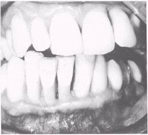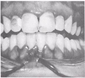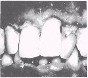 PERIAPICAL ABSCESS A periapical abscess results when the pulp has become inflamed and a small pus-like abscess forms in the pulpal canal. If left untreated, the inflammation spreads out through the apex of the root and into the bone. As the abscess gets bigger, pressure from the inflammation and pus at the apex of the root may cause the tooth to be pushed up higher in its socket. The patient may complain the tooth feels "high" when biting and very sensitive to touch. Bone loss around the apex of the tooth can occur if left untreated. The abscess and bone loss at the apex cause a radiolucency appearing like a "grape" when viewed radiographically. The course that the abscess of pus follows from the apex, into the jaw bone, and drains into the mouth is referred to as a fistula NECROSIS The death of tissue is called necrosis. Pulpal necrosis can occur as a result of untreated pulpitis or from a traumatic injury. A tooth that is necrotic must be treated. The dead pulpal tissue will decompose, producing toxins that will smell foul or rotten when the tooth is being treated. Dental pain may or may not occur from a necrosis. PATHOLOGY OF THE PERIODONTIUM Periodontal disease is the most prevalent chronic disease of mankind. The term periodontal disease refers to all diseases of the periodontium and can affect the tissues around and supporting the teeth. As a basic dental assistant, you should know symptoms of periodontal disease your patients might describe: Bleeding gingival tissue during toothbrushing Tender or red swollen gums Receeding gingival tissue Tooth shifting or elongation (looks longer) Mobile (loose) teeth Purulent exudate (pus) in-between the teeth and gums Abnormal change in the fit of partial dentures Halitosis (bad breath) GINGIVITIS Gingivitis is an inflammation involving the gingival tissues. Conditions pertaining to the gingiva of principal concern to the Dental Assistant are marginal gingivitis and acute necrotizing ulcerative gingivitis. Marginal Gingivitis Marginal gingivitis (fig. 5-7) is the most common type of gingival disease. Most frequently it is the result of poor oral hygiene and affects both the gingival margins and papilla. Chief irritants are food debris and plaque around the necks of the teeth, interproximal spaces, or overhanging margins of dental restorations. Occasionally, a localized inflamed condition may exist from a popcorn husk or toothbrush bristle. Early formation of calculus deposits can also form under the gingival sulcus (subgingival) on the facial and lingual surfaces of the upper and lower teeth. Calculus deposits can also be responsible for the occurrence of marginal gingivitis, and if left untreated, may proceed to destruction of the supporting structures (as in periodontitis). Marginal gingivitis usually starts at the tips of the papillae and then extends to the gingival margins. Swelling, loss of stippling (orange peel texture of surface) of the attached gingiva, redness, easily retractable sulcus, and foremost, a tendency to bleed easily, are the main characteristics. This condition may be generalized (exist around all teeth), or it may be localized to one or two or a group of teeth. Acute Necrotizing Ulcerative Gingivitis Acute necrotizing ulcerative gingivitis (ANUG) (fig. 5-8) is a disease commonly referred to as trenchmouth, or Vincent's infection. It is characterized during the acute stage by redness, swelling, pain, accumulation of calculus around the sulcus of the teeth, and bleeding of the gingival tissues. Usually there is a film of necrotic white or grayish tissue around the teeth. This membrane may be wiped off, leaving a raw, bleeding base. The ulceration of the gingival crest results in a characteristic punched-out appearance and loss of the interdental papillae. There is an unpleasant odor and a foul taste in the mouth. The gingival tissues bleed easily when touched, and patients will complain of not being able to brush their teeth or chew well because of the pain or discomfort. PERIODONTITIS Periodontitis (fig. 5-9) is a chronic inflammatory condition that involves the gingiva, crest of the alveolar bone, and periodontal membrane. This condition results in loss of bone that supports the teeth, periodontal pocket formation, and tooth mobility. It usually develops as a result of untreated chronic marginal gingivitis. The color of the gingival tissues is intensified and becomes bluish red as the disease progresses. A gradual recession of the periodontal tissue will occur. Neglected deposits of calculus and formation of additional calculus over time contribute to the spread of the disease. Like marginal gingivitis, it may affect the entire dentition, or only localized areas.