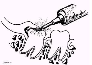 PERIODONTAL ABSCESS A periodontal abscess is caused by an infection of the periodontal tissues. It is usually the result of a long-continued irritation by food debris, deep deposits of calculus or a foreign object packed in the sulcus or inter-proximal spaces. The symptoms and signs for periodontal abscesses are similar to those for periapical abscesses. Treatment The emergency treatment plan for periodontal abscesses may include: Performing the emergency treatment guidelines Gently probing the affected area with a scaler or an explorer to establish drainage. Probe the space between the tooth surface and the gingival tissue. If probing does not establish drainage, have the patient apply hot saline water rinses to the affected area. PERICORONITIS Pericoronitis is an inflammation of the gingiva around a partially erupted tooth. During eruption, the tooth breaks through the gingiva tissue, and sometimes a small flap of tissue remains over the crown of the tooth. Debris accumulates beneath the tissue flap resulting in an acute inflammation. Inflammation can also result from constant contact between the tissue flap and the tooth in the opposing arch. Pericoronitis most often affects mandibular third molars. Symptoms A patient with pericoronitis may complain of the following: Pain when chewing A bad taste in the mouth Difficultly in opening the mouth Swelling in the neck or in the area of the affected tooth A fever Signs Signs of pericoronitis you may observe upon examination are as follows: A partially erupted tooth Red, inflamed tissue around a partially erupted tooth Pus oozing from under an overlaying tissue flap A painful reaction when finger pressure is applied Swelling in the cheek near the affected tooth Enlarged lymph nodes Elevated temperature Treatment In the treatment of pericoronitis, you may perform the following emergency procedures: Follow the emergency treatment guidelines. Irrigate under the tissue flap with a warm saline solution (figure 6-5). Gently clean the area with a sonic scaler or hand scaler. Instruct the patient to rinse with a warm saline solution every 2 hours. Contact dental officer if patient is febrile or if lymph nodes are palpable. The dental officer will determine the need to prescribe antibiotics.