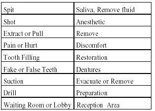 RECORDS AND RECEPTION The records and reception area (front desk) is a vital part of the dental treatment facility. To a very large extent, this department is directly responsible for the image of the dental service provided. It can determine how the patients view the dental service, its personnel, and the overall clinic operation. First impressions are critically important, and it is in this area of the clinic that patients most often have initial contact, either in person or by telephone. The basic functions of this area are to receive patients, decide their treatment eligibility, schedule dental appointments, and prepare and keep dental records. COMMUNICATION Communication skills that are efficient and effective is one of the most important parts of your job. You must be a good communicator with others. When communicating with patients, do not use technical terms, rather use simple laymen terms that the patient is familiar with and can understand. Avoid words that might upset or frighten the patient. The table below lists words to avoid, and suggestions for more appropriate words. Be an effective listener, allow the patient to explain the problem. Don't jump to conclusions without examining all the facts. Take special care with patients who have hearing or speech disabilities. You should speak slowly, distinctly, and loud enough at the contact point to be heard easily. Eye contact is a must. If you are talking to a patient and looking at something else, this will relay to the patient that you are not giving them your attention in the communication. Body Language Body language is another important form of communication. It is nonverbal, but still can send messages to the patient. It includes how you carry yourself and move around the dental clinic. Gestures, facial expressions, posture, attitudes, and tone of your voice reflect your body language. If your patient is grasping the arms of the dental chair, this might be an indication that your patient may be tense. Facial expression, such as wincing of the eyes, are also indicators that your patient may be uncomfortable. When treating a patient, always watch for body language and let the dental officer know if you see anything peculiar. You should also be aware of your own body language. In the dental operatory, your mouth will be covered with a face mask and the patient will not see any expression from your mouth. If all of a sudden, you open your eyes too wide, this might send a message to the patient that something is wrong. Remember your patient usually is looking at you and the dentist when being treated. Pay attention to body language so you do not convey a negative reaction to your patient.