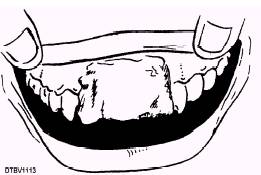 Figure 6-7.\Properly placed splint. Signs Upon examination of a type IV fracture, the dental officer may direct you to take a radiograph of the tooth to determine if there is a fracture of the root. You may observe: A fractured root (as seen in the patient's X-ray), which may be further complicated by a fracture of the crown Tooth mobility Other facial trauma associated with the accident Treatment Perform emergency treatment guidelines. Because of the severity, almost all cases of type IV fractures will be treated by the dental officer. Only in very rare cases, will the Dental Technician provide treatment. In such rare cases, the dental officer might authorize the DT to place a splint in the same way as for the type III fracture. |