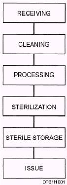 CHAPTER 10 STERILIZATION AND DISINFECTION Concerns about transmitting infectious agents, such as hepatitis virus (HBV) and human immunodeficiency virus (HIV), have caused the dental community to become more aware of the need to sterilize and disinfect instruments, materials, and other equipment to protect providers and patients. In this chapter, we will explain the sterilization and disinfection process with which you, as a dental assistant, will be involved. We will also give you an overview of the procedures so you can effectively carry out your duties. The highest level of contamination control is sterilization because it results in the total destruction of all forms of microbial life. A variety of sterilization methods and many types of liquid chemical disinfecting agents are available. Heat sterilization is preferable for all equipment and materials that can withstand high temperatures. Heat sterilization is effective, relatively easy to use, comparatively inexpensive, and readily monitored for effectiveness. Sterilization and the availability of sterile products for use in dental healthcare delivery depend on many factors. The most critical factors are as follows: Proper and efficient sterilization facility design Sound infection control practices before, during, and after sterilization The effectiveness of the actual sterilization process PHYSICAL DESIGN Dental Treatment Facilities (DTFs) must have a central sterilization room (CSR) or a central sterilization area. Centralization of sterilization activity is safer, provides more efficient use of materials and personnel, and standardizes execution and monitoring procedures. We will explain the critical design elements that make up a CSR area next. Dedicated Work Areas The design and outfitting of a sterilization area must include work areas for receiving, cleaning, processing, sterilizing, storing, and issuing of instruments and equipment. Functional Flow of the Sterilization Process Most large dental clinics will have a permanent CSR technician assigned to the sterilization area. As part of your indoctrination, you may be temporarily assigned in the CSR so you can learn your command's sterilization processes. All CSRs should have a functional flow system where equipment, instruments, and materials are first introduced into the receiving area, and work their way through to the issue area in a specific order. Figure 10-1 illustrates a CSR functional flow chart that all personnel should adhere to while working in the CSR. Once you are physically in an area of the CSR, you must not go backwards or skip an area. This will compromise the entire sterilization process. Do not process contaminated instruments, materials, or equipment in an area that may contaminate the sterilized items.
