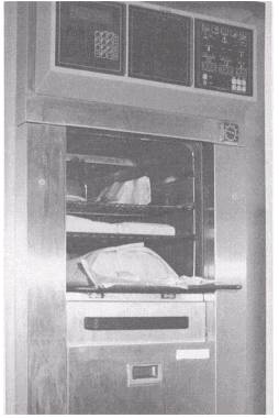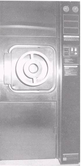 GRAVITY DISPLACEMENT.\Once this sterilizer is loaded and the door is closed as shown in figure 10-10, steam is admitted through an inlet and the sterilization process begins. A typical standard for steam sterilization is achieved at 250F or 121C after 20 to 30 minutes at 15 psi. It is important to refer to the manufacturer's instructions for operation, since exposure times can vary according to the design of the particular sterilizer. You should observe the following precautions when loading the sterilizer chamber: Do not overload. The passage of steam from the top of the chamber to the bottom should not be blocked. Place all packages on edges, with large packs at the bottom of the chamber, and small packages in an upper layer crosswise to the lower layer. This allows free passage of steam. If mixed loads of metal items and linen are sterilized together, the linen is placed on the upper shelf and the metal items on the lower. Articles that require the same amount of time and the same final steps should be sterilized together. Enclosed fluids are sterilized separately because the pressure must be slowly released. Load all packages at the same time when you are ready to sterilize. A standard operation chart for the correct exposure period of all supplies should be prepared and posted for easy daily reference. It is important to note that sterilizing conditions are based on temperature rather than on pressure. Effective steam sterilization and exposure time are measured from the moment the thermometer in the discharge line indicates the desired preset temperature. The pressure inside the sterilizer is not an indication of positive sterilization because other factors determine the pressure inside the sterilizer. Pressure merely maintains temperature. PREVACUUM STEAM STERILIZER.\The prevacuum steam sterilizer (fig. 10-11) was designed to help overcome the trapping of air in the chamber. Trapping of air is one of the greatest dangers encountered when using saturated steam under gravity cycles. When errors are made by improperly packaging items or overloading the sterilizer chamber, cool air pockets may form resulting in items not being sterilized. The speed and efficiency of the steam sterilizer may be improved by removing air from the chamber with a powerful pump, creating a nearly perfect vacuum before steam is introduced into the chamber. This procedure allows fast and more positive heat to penetrate the entire sterilizer load. The improved sterilizer is referred to as the prevacuum steam sterilizer. Full heating of the loads is faster in the prevacuum sterilizer than in the gravity displacement sterilizer. For example, wrapped instruments can be sterilized at 270F (131C) after 4 minutes exposure in a prevacuum steam sterilizer. Consult the manufacturer's instructions for specific details on operation and user maintenance information. The Bowie-Dick type test was developed for prevacuum sterilizers to determine if the air has been removed from the chamber during the prevacuum stage. Air must be removed so that steam can penetrate the load instantaneously. It must be understood that this is not a test for adequate exposure to heat in terms of time-at-temperature. A commercially prepared Bowie-Dick type test can be used by carefully reading and following the manufacturer's instructions. All