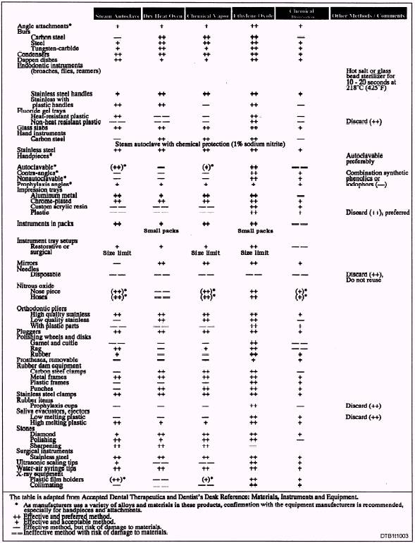 STERILIZATION MONITORING Any number of factors can reduce the effectiveness of sterilizers. Overloading and improper wrapping can prevent adequate penetration into the instrument surface. Improper timing, temperature variations, worn gaskets and seals, and sterilizer malfunctions can prevent sterilization. Heat sterilization methods are generally reliable and effective. Nevertheless, regular monitoring of sterilization cycles is necessary to detect inadequate process conditions caused by human error or equipment malfunction. Types of Sterilization Monitors Commands should base selection of sterilization monitors on reliability, appropriateness to the process, safety, and cost effectiveness. Many types of monitors are available. The three most commonly used sterilization monitors in the Navy DTFs are biological monitors, internal indicators, and external indicators. BIOLOGICAL MONITORS.\Biological monitors are designed to assess whether sterilization actually occurred. These systems consist of bacterial endospores impregnated in paper strips or sealed in glass ampules or plastic vials. INTERNAL INDICATORS.\Internal indicators are chemical dyes that change color when exposed to steam, dry heat, or chemical vapor for a specified period of time. When placed inside an instrument pack, they determine whether the conditions necessary for sterilization have been met. EXTERNAL INDICATORS.\External indicators are chemical dyes that change color upon short exposure to sterilizing conditions. They are generally printed on packaging materials or supplied in tape form and are necessary to distinguish processed packages from those that have not been cycled. External indicators are not sensitive enough to be processed as an internal indicator and should not be used. Biological Monitoring After endospore tests are processed through a sterilization cycle, they must be incubated according to the manufacturer's instructions. A pH indicator in the medium changes color when the ampule of endospores germinate and produce acids. This visually identifies a failure in the sterilization process. As a minimum, Table 10-3.\Sterilization and Disinfection of Dental Instruments and Materials