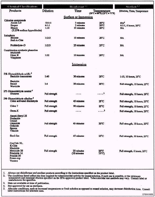 GENERAL CATEGORIES OF LIQUID CHEMICAL AGENTS A large variety of liquid disinfectants are available today, and it is probable that many new ones will become available in the future. When selecting a product, make sure that the label has an EPA registration number on it. Table 10-15, is a guide to chemical agents for disinfection and sterilization. Since they may be subject to change, be sure to read the manufacturer's instructions before using. Next, we will discuss the four most commonly used chemical agents, glutaraldehyde and chlorine dioxide based solutions, iodophors, and phenolics. Glutaraldehyde-Based Solutions These agents are available in several formulations differing in pH, concentration, use in dilution, and exposure time. They are classified as high-level disinfectants or sterilants. Always wear impermeable gloves and protective eyewear when handling these solutions. Irritation of the hands is common and personnel are always at risk of splashes occurring whenever liquids are being Table 10-5.\Guide to chemical agents for disinfection and sterilization.