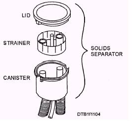 Figure 11-4.\Solids separator. HVE (fig 11-5). The principle of this evacuator is low pressure and high volume. A tip is placed into the HVE handpiece and the suction turned off and on by a control valve or button on the handle. Some of the newer models of HVEs have a quick disconnect device and are now autoclavable. Follow the manufacturer's instructions for maintenance. SALIVA EJECTOR.\During certain procedures, the provider may choose to keep the working site dry by using the saliva ejector. This type of suction is effective only when there is a limited amount of fluids, such as saliva, to remove from the patient's mouth. It can also be used to hold the tongue away from the working site and keep an area dry for placement of material that takes a long time to set A disposable plastic saliva tip inserts into the rubber end of the saliva ejector assembly and is turned on/off by a control valve. Follow the manufacturer's instructions for maintenance.