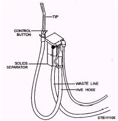 Figure 11-5.\High-volume evacuator (HVE). This system delivers the drive air and coolant to whichever handpiece is lifted from the dental unit. The control system is made up of two parts: handpiece controls and a foot control. HANDPIECE CONTROLS.\Most handpiece controls are located on the bracket tray that can accommodate three handpieces (fig. 11-6). The water coolant flow and maximum drive pressure are individually adjustable for each handpiece. Most units use the following international symbols: A blue dot identifies a water control. A yellow dot identifies an air control. A red dot identifies the ON or active position. Every dental unit has a master ON-OFF toggle or switch. It turns on the air and water to the control system. When it is turned off, none of the items on the unit will function. This switch should be OFF whenever the unit is not in use to prevent flooding in the event of a leak while the system is unattended. The ON/OFF indicator provides a visual indication that the system is pressurized when the master switch is ON. |