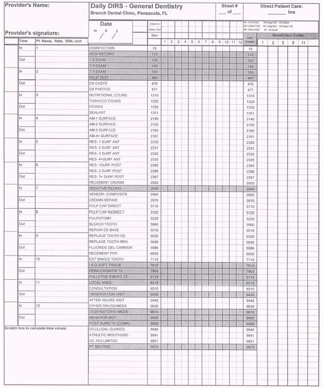 Figure 2-4.\Daily DIRS form. to voice and document how they are treated and are able to report any unsatisfactory or satisfactory complaints or compliments concerning the treatment they have received. PATIENT CONTACT REPRESENTATIVE In all Navy dental clinics, a patient contact representative is appointed in writing by the commanding officer. This person's picture is posted in the front desk or reception area and should be visible for all patients to see. All patient complaints or compliments are channeled through the patient contact representative and then up the chain of command for action. Validated patient compliments and complaints are incorporated into the command's annual assessment for the Quality Assurance (QA) Program. Follow BUMEDINST 6010.13 and your clinic's instruction for follow-up actions and reporting instructions. |