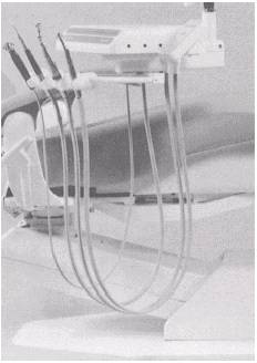 Figure 11-6.\Handpiece controls. can cause air and waterleaks. Many providers use a "quick disconnect" that attaches to the coupling. By gently pulling on the handpiece, the operator is able to change handpieces very quickly. The quick disconnect is also available with a 360 swivel that allows the handpiece to be turned around without tangling up the hoses. Perform a daily operational check on the quick disconnect equipment. Inspect "O" rings and replace them if found frayed or missing. FOOT CONTROL.\All handpieces are operated by the provider through the use of a foot control (rheostat) device. A valve inside the foot control regulates the handpiece speed and provides an air signal that activates the air and water coolant flow. The foot control is operated by light foot pressure applied to any part of the disk. Some foot controls may also be equipped with a wet/dry toggle switch and a chip blower. The wet/dry toggle switch can shut off the water coolant to the handpiece without moving the hands from the treatment area. The chip blower sends a jet of air through the handpiece when not in use to remove any debris accumulated in the treatment site. Other Controls The other controls that could be on the bracket table and assembly, depending on the make and model, are as follows: WATER COOLANT ON/OFF TOGGLE\ Stops the flow of water coolant to all handpieces. AIR COOLANT FLOW CONTROL\Adjusts the air coolant flow to all handpieces and can completely shut off the air coolant. DRIVE AIR PRESSURE CONTROL\Adjusts the drive air pressure to the handpiece with an adjustment screw for each handpiece. SYRINGE FLOW CONTROL\Adjusts the air and water flow from the three-way syringe. AUTOMATIC HANDPIECE HOLDER\ Shuts off air and water to the handpiece when it is in the holder. HANDPIECE TUBING FLUSH SYSTEM\ Some newer models of dental units have a handpiece tubing flush system that quickly and thoroughly flushes the handpieces to wash away contaminants accumulated in the handpiece and tubing. This system saves wear on the handpieces by sending water directly to the handpiece, and bypassing the control block and not requiring the handpiece turbine to operate. Flush the handpieces at the beginning of each day for 1 minute, after each patient, and at the end of the workday for 30 seconds following BUMEDINST 6600.10. THREE-WAY SYRINGES\Each dental unit has at least one 3-way syringe that provides a stream of (1) air, (2) water, or (3) a combination spray of air and water. Many of the new syringes have a quick disconnect that allows the syringe tip to be changed for each patient and is autoclavable. The water temperature control, if equipped, on the dental unit, can be adjusted to keep the temperature of the water at approximately 130F. DENTAL LIGHT The dental light (fig. 11-7) illuminates the patient's mouth and treatment area. It may be on a ceiling track or mounted to the DDS. The light should be properly positioned 30-36 inches from the patient's face. Most dental lights mounted to the DDS consist of three major assemblies: the transformer and rigid arm assembly, flex arm assembly, and the light head assembly. The intensity switch located on the transformer housing is used to set the intensity of the light to low, medium, or high settings. The dental light head rotates on three different axes. It can rotate as much as 180 horizontally, 125 vertically, and 45 diagonally from either side. To perform a daily operational check on the dental light. Turn light on. Move light ensuring a free full range of motion. Light should not drift. If drifting is discovered, initiate a repair request Light Replacement Often, at the most inconvenient time, the bulb in the dental light burns out. To avoid further delays, you need to know how to quickly and properly replace the bulb. Use the following steps to change a bulb: Turn the light switch to the off position and allow the bulb to cool. Release the fastening devices on the light shield and move the shield aside. Use a gauze pad or cloth to protect your fingers when removing the bulb. Very carefully pull the old bulb from the socket and discard it. Most units have a spare bulb compartment on the light assembly. Open the wrapper of the new bulb to expose the bulb pins, but do not remove the bulb from the wrapper. Use the wrapper to protect the bulb #while installing it. This is necessary because finger oils limit bulb life and can affect light performance.