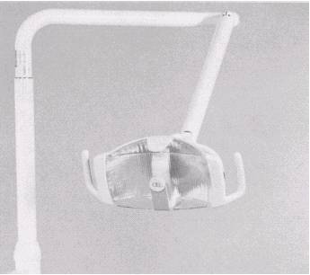 Figure 11-7.\Dental light. If you do touch the bulb by mistake, gently clean it with cotton soaked in ethyl alcohol. Carefully insert the new bulb into the socket and remove the wrapper. CAUTION Never operate the dental light with the light shield removed. The shield is your protection against injury if the bulb shatters. Replace the light shield, and test the dental light to ensure it works properly. Notify the dental repair department to replace the spare light bulb you used, or if the light does not begin to function properly. Light Shield The light shield is constructed of hard plastic and is used to protect the dental light bulb and the reflector. Because the dental light is close to the patient treatment area, it is frequently soiled by splatter and aerosols. Use the following steps to clean the light shield: Ensure the light has cooled before cleaning the light shield. Release the fastening devices on the dental light to remove the light shield. Immerse the shield in warm, soapy water, rinse in clear water, and then wipe dry with a lint-free cloth. When the shield is clean, replace it on the dental light and test for proper operation. Light Reflector The light reflector is constructed of glass and is protected by the light shield. Use the following steps to clean the inside surface of the reflector when dust or spots reduce the efficiency of the light: Allow the light and reflector to cool before removing the light shield. Use a soft, lint-free cloth to gently remove any accumulated dust particles. Unplug the DDS or dental light. Use a dampened cloth with water or a diluted solution of mild dishwashing soap for a more thorough cleaning. Ensure the cloth is not so wet that it drips into the electrical parts of the light. Wipe the inside surface of the reflector in one direction only. Ensure no residue remains on the reflector. Never use abrasives or chlorine on the surface of the reflector. Doing so can damage or discolor the surface of the reflector, causing poor lighting. Do not rub heavily or clean the reflector when it is hot. Never soak the reflector in cleaning solutions. After cleaning is completed, replace the light shield and test for proper operation. |