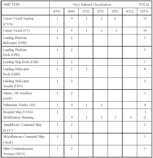 DENTAL DEPARTMENT HEAD The head of the dental department of a ship is designated the "dental officer." He or she is usually the senior dental officer on board. The type or class of ship will determine how many other dentists are assigned to the department. They could be general dentists or specialty providers (oral surgeon, prosthodontist, and so forth). The primary responsibility of the dental department head is to maintain the dental health of all personnel assigned to the ship and personnel attached to squadrons, ships in the battle group, staffs, and any other units dependent upon the dental department for dental care. If a ship has more than one dentist, the department head may appoint a dentist on board as a division officer to assist him or her with administrative duties and the supervision of the enlisted personnel. ENLISTED DENTAL PERSONNEL Enli sted dental personnel assigned to the dental department of a ship serve as technical assistants to the dental officer. The type or class of ship that you serve on will determine how many and what type of Navy Enlisted Classification Codes (NECs) enlisted dental personnel will have to support the dental department. These classifications are discussed in this volume, chapter 1, "General Administration and Orientation." Leading Chief or Senior Chief Petty Officer Depending on the structure of the manning for a specific class ship, your dental department may have a leading chief petty officer (LCPO) or senior chief petty officer (SCPO) assigned. His or her responsibilities are for the smooth and efficient operation of the dental department and the supervision of enlisted personnel. Leading Petty Officer In the absence of an LCPO billet, many of the smaller class ships will have a Dental Technician Second Class or First Class Petty Officer in charge of the dental department. Most leading petty officers (LPOs) carry the NEC DT-8703, Dental Technician, Administration. The responsibilities are similar to an LCPO. Dental Assistants Dental assistants are junior Dental Technicians (E-1 through E-4) who perform a variety of shipboard and professional duties. They have graduated from Dental Technician "A" school and are classified as a DT-0000. Dental assistants' duties may include: preventive maintenance, the ship's 3-M program, assignment to a battle dressing station (BDS), and assisting the medical department in the treatment of casualties. In addition, the dental assistants assist the dental officers in dental procedures, performing oral prophylaxis, radiology, and supply and dental administration. Next we will discuss the different classes of ships that have dental departments. SHIPS WITH DENTAL DEPARTMENTS Table 12-1 is a list of the different types of ships that have dental departments. Some ships have one dental officer and two to three Dental Technicians assigned, while larger ships may have two to four dental officers with 4 to 13 Dental Technicians assigned. The above manning numbers represent the ship's basic allowance (BA) for Dental Technicians. Please note that the Hospital ship has only 1 Dental Technician assigned as permanent ship's company (1 Table 12-1.\Different types of ships