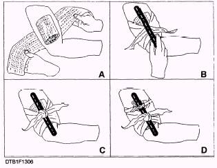TOURNIQUETS. \Tourniquets are used as a last resort, and then only for controlling bleeding in the extremities. If you cannot control serious bleeding in an extremity by applying direct pressure, elevation, or by using the appropriate pressure point, you may apply a tourniquet. You will rarely have to apply a tourniquet. When you do, it will most likely be a situation when part of an extremity is amputated (cut off). A tourniquet consists of a pressure pad, a band, and a device for tightening the band. Place the pressure pad over the main artery supplying blood to the injured extremity. Wrap the band around the extremity and over the pressure pad. Tighten the band only enough to shut off the supply of blood to the injured extremity. You may use a rolled compress, battle dressing, or bandage as a pressure pad. If the materials are not available, you may use any round, smooth pressure object, such as a rolled handkerchief, a flat stone, or a rifle shell. If no pressure object can be found, apply the band without it. You may use any long, flat material, (i.e., bandage, belt, stocking, strip of rubber, or necktie) as the tourniquet band. The band must be flat. Narrow materials such as rope, wire, or string should not be used; they will cut into the casualty's flesh. Most Navy emergency medical kits contain a webbed band with a buckle on it. The band is tightened by pulling one end through the buckle. This eliminates the need for a separate device to tighten the band. If you are using another type of band, you may use a small, short stick to tighten it. There are some general rules to keep in mind when applying a tourniquet. Apply it over a main artery between the wound and the main part of the body. Apply the tourniquet as close to the wound as possible, making sure that the tourniquet is not touching the wound and that it is not placed over a joint. Once a tourniquet is correctly applied, only experienced medical personnel may loosen or remove it. Refer to figure 13-6 and use the following steps to apply a tourniquet: 1. Place the pressure pad or similar pressure object over the main artery supplying blood to the injured extremity (see A in fig. 13-6).