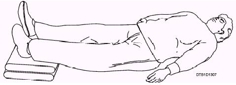Figure 13-6.\Steps in tourniquet application. 2. Wrap the band once around the extremity and over the pressure pad. Place a short stick on the crossing band (see B in fig. 13-6). 3. Knot the band over-the-stick (see C in fig. 13-6). 4. Twist the stick to tighten the tourniquet just enough to control the flow of blood. Do not make it any tighter than necessary. A tourniquet that is too loose will not control the bleeding; one that is too tight may further injure the extremity. 5. Tie the stick in place with a strip of bandage or other material (see D in fig. 13-6). If bleeding fails to stop after the band has been tightened, there is a good chance the pressure pad is not placed directly over the artery. If this is the case, loosen the tourniquet and reposition the pad. After you have brought the bleeding under control, place a sterile dressing securely over the wound. Do not cover the tourniquet with a dressing. Do not loosen the tourniquet. Again, once a tourniquet has been correctly applied, only experienced medical personnel may loosen or remove it. After placing the dressing, treat the casualty for shock. Finally, complete the field medical card. In addition, write the letter "T" and the time the tourniquet was applied (e.g., T-0830) on the casualty's forehead. Use a skin pencil, colored antiseptic, ink, or crayon for this purpose. Shock Review the shock section in chapter 9, Dental Technician, Volume 2, NAVEDTRA 12573, for causes, signs, symptoms, and treatment of basic shock, fainting, anaphylactic shock, and insulin shock. Shock may develop at the time of the injury or hours later. Never put off treating a casualty for shock until the signs and symptoms appear. Begin treatment immediately. If shock has not yet developed, the treatment may prevent it from developing. If shock has already developed, the treatment may prevent it from becoming worse. TREATMENT OF SHOCK.\To prevent shock or to treat shock that has already developed, you should position the casualty, conserve body heat, and relieve pain. Position the Casualty.\The casualty should be lying down. Never let that person sit up, stand, or walk around. Generally, the standard position for the shock casualty is lying on the back with the feet elevated 6 to 12 inches (fig. 13-7). You must consider the type of injury before deciding on the position. The casualty's injuries may prevent you from using the standard position. For example, if a person with a chest wound has trouble breathing, you will raise the head slightly, and place the patient in a sitting or semi-sitting position. If a casualty is vomiting or bleeding around the mouth, place the patient on the side or back with the head turned to one side and lower the feet. If the face is flush rather than pale, or if you have any reason to suspect head injury, do not raise the feet. Instead, keep the head level with or slightly higher than the feet. If the casualty has broken bones, you must judge the best position for both the fractures and for shock. A fractured spine must be immobilized before the casualty is moved at all to avoid further injuries. A helpful mnemonic: If the face is red, raise the head; if the face is pale, raise the tail (feet). Conserve Body Heat.\Loss of body heat can cause shock to develop or to become worse. Keep the casualty warm. Cover the patient with blankets or any dry material. Do not overheat the casualty. Relieve Pain.-Pain is a major cause of shock. Treatment of injuries will often reduce pain. Pain may also be relieved by slightly repositioning the casualty. Under mass casualty conditions, you may have to administer morphine to certain types of casualties to relieve pain. The condition under which morphine may be administered will be discussed in the Morphine Administration section. Morphine must never be administered if there is evidence of severe or worsening shock. Injuries to Bones, Joints, and Muscles Injuries to bones, joints, and muscles are some of the most common situations that you will encounter. These injuries can range from the simple to the critical and life threatening. Whether the injury is mild or severe, your ability to provide quick and efficient emergency care may prevent further pain and injury. An essential part of em emergency treatment for fractures consists of immobilizing the injured part with splints so the sharp ends of broken bones will not move around and cause further damage to nerves, blood vessels, or vital organs. Splints are also used to immobilize severely injured joints or muscles and to prevent the enlargement of extensive wounds. You must have a general understanding of the types and uses of splints. SPLINTS.\Whether ready made or improvised, splints must fulfill certain requirements. They should be lightweight, but must be strong and fairly rigid. They should be long enough to reach the joints above and below the fracture. Splints should be wide enough so that the bandages used to hold them in place will not pinch the injured part. Splints must be padded on the sides that touch the body; if they are not properly padded, they will not fit well and will not adequately immobilize the injured part. If you have to improvise the padding for a splint, you can use articles of clothing, bandages, cotton blankets, or any other soft material. If the casualty is wearing heavy clothes, you may be able to apply the splint on the outside, allowing the clothing to serve as part of the required padding. To apply a splint to an injured part, fasten it in place with bandages, strips of adhesive tape, articles of clothing, or any other available material. If possible, one person should hold the splint in position while another person fastens it. Figure 13-8 shows a properly placed splint for a fractured femur. Although splints should be applied snugly, they should never be tight enough to interfere with blood circulation. Remember to leave the fingers or toes exposed. If the tips of the fingers or toes become blue or cold, 