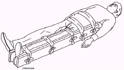 Figure 13-8.\Splint for a fractured femur. Remember that any injured part is likely to swell, and splints or bandages that are all right when applied may later be too tight. |