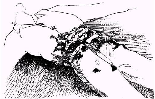Figure 13-10.\Exposed intestine. Fasten the bandage firmly so that the dressing will not slip around, but do not apply more pressure than is necessary to hold the bandage in position. Ideally, the dressing should be folded under and then over the intestines (envelope style). 3. Apply an occlusive material such as aluminum foil or plastic wrap over sterile dressing and secure in place with tape or other material. This will help keep the sterile dressing moist. 4. Treat for shock. The casualty must be taken to a medical facility at the earliest opportunity. Do not give the patient anything to eat or drink. If he/she complains of great thirst, moisten the lips with a small amount of water, but do not allow the patient to swallow. Summary of Wounds Although it is not always necessary to know what agent or object caused a wound, it is often helpful because it may give you some idea of the probable size of the wound, its general nature, the extent to which it is likely to be contaminated with foreign matter, and what special dangers must be guarded against. The emergency treatment for all wounds consists mainly of stopping the flow of blood, treating for shock, and preventing infection. For a casualty with multiple wounds, first treat the wound that appears to be most life-threatening. Be sure to check all possible points of the body for injury. Your first concern is to stop the bleeding, preferably by direct pressure, elevation, or the use of pressure points. A tourniquet should be used only if the other methods do not control the bleeding. Do not spend undue time trying to clean a dirty wound. This will be done by medical personnel. But, apply a dressing to help prevent additional contamination of the wound. If a foreign object is near the surface and exposed, you may remove it. But if the injury is caused by a knife or other object that is still embedded, do not remove the object. It may cause massive bleeding. Simply apply dressings around the object. |