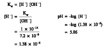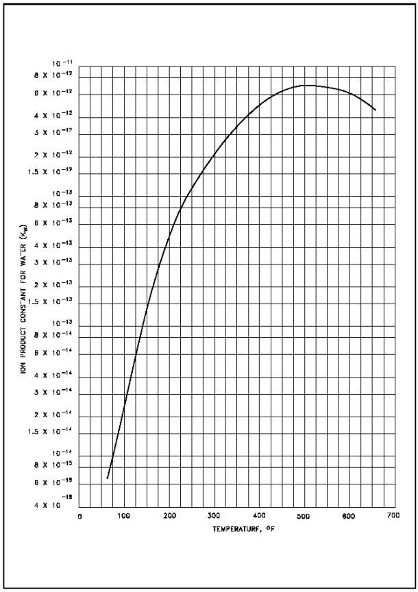 The product of ionic concentrations, KW = [H+] [OH], is called the Ion Product Constant for water, or more frequently, the Ionization Constant or Dissociation Constant. At 25C, KW equals 1 x 10-14. KW varies with temperature and, at 37C (body temperature), the value is about 3.4 x 10-14. Figure 17 illustrates the relationship of the Dissociation Constant with water temperature. As indicated earlier, a change in temperature causes a change in equilibrium in a chemical reaction. Because the ionization of water is an equilibrium process, it is also affected by temperature. The Dissociation (or Ionization) Constant, Kw, for water increases with increasing temperature up to about 500F and then decreases. Experimental values of KW at various temperatures are listed in Table 5 and graphed in Figure 16. Notice in Table 5 that the pH of pure water changes with temperature. For pure water at any temperature, however, [H+] = [OH-]. It should be noted that the equation pH + pOH = 14 is true only at or near 25C (77F). Example: The hydroxyl concentration [OH-] of a water solution at 25 C is 7.2 x 10-9 moles/liter. Calculate the pH of the solution. Solution:
