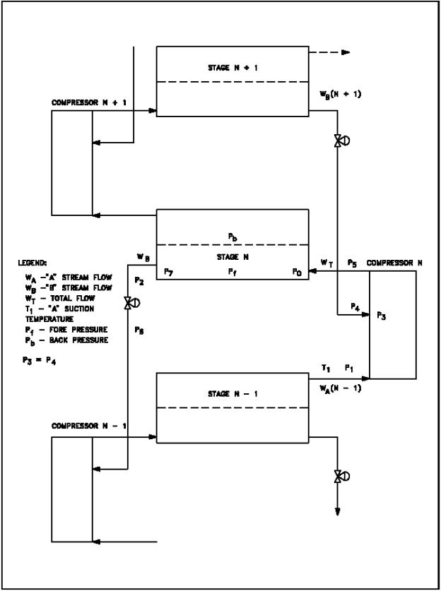 being processed is the same as that of the feed to be charged. To choose this feed point, therefore, it must be possible to calculate the concentration of U235F6 in the process gas at any point in the cascade. These calculations can be made by knowing two things: first, the concentration of U235F6 in the process gas at several points in the cascade (determined by laboratory and instrument analysis); and second, the increase in the concentration of U235F6 accomplished by each stage. This is called the stage enrichment and should not be confused with the separation accomplished by a stage previously discussed. Therefore, by knowing the stage enrichment and the U235F6 concentration at some point in the cascade, it is possible to determine the concentration at other points. The feed material ordinarily charged into a plant contains a very small percentage of U235F6 with the remainder being U238F6. Consequently, a far greater amount of the feed flows downward in the cascade and is removed as tails than is removed at the top of the cascade as U235F6 or product. For this reason, as we progress upward in the cascade from the feed point, the total flow through the converters becomes progressively smaller. It follows, therefore, that in the ideal design each stage would be different in size from the adjacent stages. However, since the cost of construction of a production cascade is of great importance, a lower cost may be achieved by the use of many identical units. For this reason, the cascade is composed of a series of sections, each of which contains a large number of identical stages. The change in equipment size is accomplished in a step-wise manner by varying the equipment size of each so-called section. Circuit Balances Of major importance in a production cascade is the ability to calculate pressures, temperatures, and flows of the process gas which cannot be practically or economically measured by instrumentation. Since the cascade is made up of sections each of which contains a large number of identical stages and since the stage is the smallest separating unit of a cascade, these calculations are made on a stage basis. This system of calculating temperatures, pressures, and flows is commonly referred to as a circuit balance and consists of a series of calculations made from those pressures and temperatures ordinarily measured by instrumentation in the cascade, and from experimental data obtained from test loop studies. For illustration purposes, the pressures, temperatures, and flows in a typical X-31 stage which are taken by instrumentation, plus those to be calculated, are shown in Figure A-3. It is obvious that the cost to install instruments in every stage to measure all of the values indicated would be prohibitive.