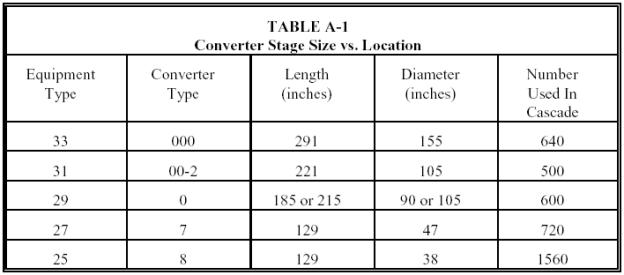 Because of their number and complexity, the mathematical formulas used in calculating the pressure points in Figure A-3 will not be presented. The operator will read and record only those values which are measured by instruments and will not be required to perform any of the mathematical calculations involved in completing a circuit balance. However, the following discussion will give an indication as to the procedures involved in determining these values. To calculate a circuit balance for Stage N in Figure A-3, pressures Pl and P2 and temperature Tl are recorded. Then, knowing P 1 and T 1 and a constant previously determined in a test loop, it is possible to calculate the flow WA (N - 1). Since the "A" barrel of the compressor has essentially a constant suction volume in the normal operating range, the interstage flow is proportional to the compressor "A" suction pressure and temperature. Next, it is known that the flow in a cascade must operate at a steady state condition to prevent an accumulation of deficiency of inventory in any one section. It may therefore be assumed that the flow downward to a stage is equal to the flow upward from the same stage. (This assumption is not valid for all stages in a cascade but for practical applications the error is negligible.) From this assumption, WB is equal to WA (N - 1). With P2, WB, and pressure drop data obtained in the test loop, P7 can be calculated. In a test loop, data is taken on converters of different sizes and types to determine pressure variations with different amounts of flow and cut. If WA is found in the same manner as WA (N - 1), it is then possible with the test loop data to calculate Pb. Also, with the converter data, and knowing WB, P7, and WT (WT = WA + WO, Po and subsequently, Pf are found. Again using pressure drop data, PS can be calculated from WT and Po, With P 5 P 3is calculated by knowing the "B" pressure ratio of the compressor. From the calculated values obtained from a circuit balance, it is possible to make further calculations which indicate the operational and productive characteristics of the cascade. For example, Pf, Pb, and the flows through a converter must be known before the actual permeability of the barrier can be calculated. Also, these values make it possible to accurately predict horsepower requirements under varying conditions of flow and pressure. Another important application of the circuit balance is in the determination of inventory in the cascade where pressures and temperatures not otherwise measured are required. <%CUT%> The actual separation of U235F6 from U238F6 in a gaseous diffusion plant is accomplished in the converter. The converter, sometimes referred to as a diffuser, contains the barrier tubing through which diffusion takes place. In the previous section we studied the flow through the converter as a part of a stage. In this section we will see what takes place inside the converter. In all, the entire cascade contains over 4000 converters -- one in each stage. The stage size varies with the location in the cascade as shown in the table below.