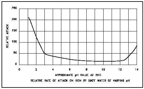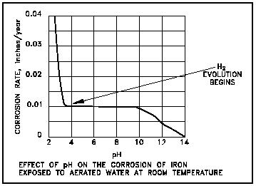 Figure 7 Effect of pH on the Corrosion Rate of Iron in Water First, consider the exposure of iron to aerated water at room temperature (aerated water will contain dissolved oxygen). The corrosion rate for iron as a function of pH is illustrated in Figure 7. In the range of pH 4 to pH 10, the corrosion rate of iron is relatively independent of the pH of the solution. In this pH range, the corrosion rate is governed largely by the rate at which oxygen reacts with absorbed atomic hydrogen, thereby depolarizing the surface and allowing the reduction reaction to continue. For pH values below 4.0, ferrous oxide (FeO) is soluble. Thus, the oxide dissolves as it is formed rather than depositing on the metal surface to form a film. In the absence of the protective oxide film, the metal surface is in direct contact with the acid solution, and the corrosion reaction proceeds at a greater rate than it does at higher pH values. It is also observed that hydrogen is produced in acid solutions below a pH of 4, indicating that the corrosion rate no longer depends entirely on depolarization by oxygen, but on a combination of the two factors (hydrogen evolution and depolarization). For pH values above about pH 10, the corrosion rate is observed to fall as pH is increased. This is believed to be due to an increase in the rate of the reaction of oxygen with Fe(OH)2 (hydrated FeO) in the oxide layer to form the more protective Fe203 (note that this effect is not observed in deaerated water at high temperatures). A plot of the relative corrosion rate for iron at various pH values in 590F, oxygen-free water is presented as Figure 8. The curve illustrates that the corrosion rate of iron in high temperature water is lower in the pH range of 7 to 12 than it is at either lower or higher pH values (at very high pH values, greater than pH 13.0, the oxide film becomes increasingly more soluble because of increased formation of soluble Fe02 at hightemperatures, and corrosion rates increase). As a result of the data plotted in Figure 8 and other similar measurements, it is general practice to maintain high temperature water in the alkaline condition (but below very high pH values) to minimize the corrosion of iron and the steels exposed to the high temperature water.