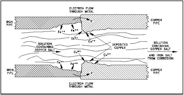Corrosion at Iron-Copper Pipe Junction Figure 10 shows the junction of iron and copper pipes containing a solution of a copper salt. The oxidation potential of iron is sufficiently greater than that of copper so that iron is capable of reducing Cu" ions to copper metal. In this case, iron corrodes near the junction, and additional copper builds up on the copper pipe near the junction. The solution to which the metal junction is exposed need not contain a salt of one of the metals for galvanic corrosion to occur. If the iron-copper junction were exposed to water without Cu+2 ions, the reduction reaction would be as shown in Equation (2-4).