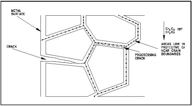 Cracking Stress corrosion cracking (SCC) is a type of intergranular attack corrosion that occurs at the grain boundaries under tensile stress. Grain boundaries are discussed in detail in the Material Science Handbook. SCC occurs in susceptible alloys when the alloy is exposed to a particular, specific environment if the alloy is in a stressed condition. Stress corrosion cracking appears to be relatively independent of general uniform corrosion processes. Thus, the extent of general corrosion can be essentially nil, and stress cracking can still occur. Most pure metals are immune to this type of attack. According to the most widely accepted theory, stress corrosion cracking is caused by a process called chemisorption. Unlike relatively weak physical absorption, such as hydrogen gas on platinum metal, chemisorption may be thought of as the formation of a compound between the metal atoms on the surface as a monomolecular layer of the chemisorbed substance, such as Cl-, OH-, Br-, and some other ions. The formation of this chemisorbed layer greatly reduces the attraction between neighboring metal atoms. A defect initially present then grows as the metal atoms separate under stress, more chemisorption occurs, and the process continues. In very severe cases, the time required for this cracking to occur is only a matter of minutes. Many stainless steels are susceptible to stress corrosion cracking. Stainless steels containing 18 percent chromium and 8 percent nickel are susceptible to cracking in environments containing chloride ions and in concentrated caustic environments (that is, in environments where the hydroxyl ion concentration is high). On the other hand, these types of stainless steels do not exhibit any tendency to crack when they are exposed to water environments containing nitrate (NO3-, sulfite (S03-), and ammonium (NH3+) ions. SCC is of great concern because it can readily crack metal of appreciable thickness. If the environment is severe enough, cracking can occur in a very short period of time. The crack can then lead to a serious failure of the component, or the system, and all the attendant results (for example, contamination, loss of coolant, and loss of pressure). The most effective means for preventing SCC are proper design, reducing stress, removing critical environmental contributors (for example, hydroxides, chlorides, and oxygen), and avoiding stagnant areas and crevices in heat exchangers where chlorides and hydroxides might become concentrated. Low alloy steels are less susceptible than high alloy steels, but they are subject to SCC in water containing chloride ions. Nickel based alloys are not affected by chloride or hydroxide ions. Two types of SCC are of major concern to a nuclear facility. Chloride Stress Corrosion Cracking (Stainless Steels) The three conditions that must be present for chloride stress corrosion to occur are as follows. Chloride ions are present in the environment Dissolved oxygen is present in the environment Metal is under tensile stress Austenitic stainless steel is a non-magnetic alloy consisting of iron, chromium, and nickel, with a low carbon content. This alloy is highly corrosion resistant and has desirable mechanical properties. One type of corrosion which can attack austenitic stainless steel is chloride stress corrosion. Chloride stress corrosion is a type of intergranular corrosion. Chloride stress corrosion involves selective attack of the metal along grain boundaries. In the formation of the steel, a chromium-rich carbide precipitates at the grain boundaries leaving these areas low in protective chromium, and thereby, susceptible to attack. It has been found that this is closely associated with certain heat treatments resulting from welding. This can be minimized considerably by proper annealing processes. This form of corrosion is controlled by maintaining low chloride ion and oxygen content in the environment and the use of low carbon steels. Environments containing dissolved oxygen and chloride ions can readily be created in auxiliary water systems. Chloride ions can enter these systems via leaks in condensers or at other locations where auxiliary systems associated with the nuclear facility are cooled by unpurified cooling water. Dissolved oxygen can readily enter these systems with feed and makeup water. Thus, chloride stress corrosion cracking is of concern, and controls must be used to prevent its occurrence. Figure 14 illustrates intergranular stress corrosion cracking. The pressure of a tensile stress opens up intergranular cracks and accelerates further corrosion. Chloride stress corrosion is a particularly significant problem in the operation of nuclear facilities because of the wide use of austenitic stainless steel, and the inherent presence of high tensile stresses associated with pressurization. Chloride stress corrosion cracks have been known to propagate in austenitic stainless steel at stresses of about one-fifth yield strength with chloride concentrations of less than 50 ppm. Yield strength is discussed in detail in the Material Science Handbook.