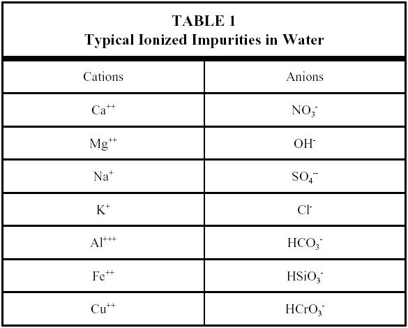 Water treatment is necessary to remove the impurities that are contained in water as found in nature. Control or elimination of these impurities is necessary to combat corrosion, scale formation, and fouling of heat transfer surfaces throughout the reactor facility and support systems. The following are three reasons for using very pure water in reactor facility systems. 1. To minimize corrosion, which is enhanced by impurities. 2. To minimize radiation levels in a reactor facility. Some of the natural impurities and most of the corrosion products become highly radioactive after exposure to the neutron flux in the core region. If not removed, these soluble and insoluble substances may be carried to all parts of the system. 3. To minimize fouling of heat transfer surfaces. Corrosion products and other impurities may deposit on core surfaces and other heat transfer regions, which result in decreased heat transfer capabilities by fouling surfaces or blockage of critical flow channels. Areas of high concentrations of these impurities and corrosion products may also lead to extreme conditions of the various corrosion processes with resultant failure of components or systems. There are several processes used in reactor facilities to purify the water in the systems and water used as makeup. Deaeration is used to strip dissolved gases, filtration is effective in the removal of insoluble solid impurities, and ion exchange removes undesirable ions and replaces them with acceptable ions. Typical ionized impurities found in water are shown in Table 1.