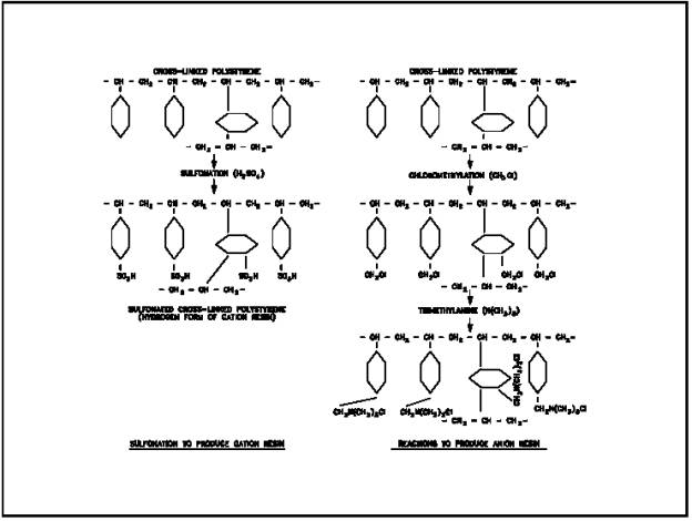 Ion exchange is a process used extensively in nuclear facilities to control the purity and pH of water by removing undesirable ions and replacing them with acceptable ones. Specifically, it is the exchange of ions between a solid substance (called a resin) and an aqueous solution (reactor coolant or makeup water). Depending on the identity of the ions that a resin releases to the water, the process may result in purification of water or in control of the concentration of a particular ion in a solution. An ion exchange is the reversible exchange of ions between a liquid and a solid. This process is generally used to remove undesirable ions from a liquid and substitute acceptable ions from the solid (resin). The devices in which ion exchange occurs are commonly called demineralizers. This name is derived from the term demineralize, which means the process whereby impurities present in the incoming fluid (water) are removed by exchanging impure ions with H+ and OH- ions, resulting in the formation of pure water. H+ and OH- are present on the sites of resin beads contained in the demineralizer tank or column. There are two general types of ion exchange resins: those that exchange positive ions, called cation resins, and those that exchange negative ions, called anion resins. A cation is an ion with a positive charge. Common cations include Ca++, Mg++, Fe++, and H+. A cation resin is one that exchanges positive ions. An anion is an ion with a negative charge. Common anions include Cl-, SO4--, and OH-. An anion resin is one that exchanges negative ions. Chemically, both types are similar and belong to a group of compounds called polymers, which are extremely large molecules that are formed by the combination of many molecules of one or two compounds in a repeating structure that produces long chains. A mixed-bed demineralizer is a vessel, usually with a volume of several cubic feet, that contains the resin. Physically, ion exchange resins are formed in the shape of very small beads, called resin beads, with an average diameter of about 0.005 millimeters. Wet resin has the appearance of damp, transparent, amber sand and is insoluble in water, acids, and bases. Retention elements or other suitable devices in the top and bottom have openings smaller than the diameter of the resin beads. The resin itself is a uniform mixture of cation and anion resins in a specific volume ratio depending on their specific gravities. The ratio is normally 2 parts cation resin to 3 parts anion resin. In some cases, there may be chemical bonds formed between individual chain molecules at various points along the chain. Such polymers are said to be cross-linked. This type of polymer constitutes the basic structure of ion exchange resins. In particular, cross-linked polystyrene is the polymer commonly used in ion exchange resins. However, chemical treatment of polystyrene is required to give it ion exchange capability, and this treatment varies depending on whether the final product is to be an anion resin or a cation resin. The chemical processes involved in producing anion and cation resins are outlined in Figure 1 and Figure 2, beginning with the formation of cross-linked polystyrene. The polymer itself is a covalent compound. By the chemical reactions indicated in Figure 2, hydrogen atoms covalently bonded to the original polymer at certain sites are replaced by functional groups (called radicals) such as S03H (sulfonic acid) and CH2N(CH3)3C1 (quaternary ammonium). Each such group is covalently bonded to the polymer, but each also contains an atom that is bonded to the radical group by a predominantly ionic bond. In the two examples above, H in S03H and Cl in CH2N(CH3)3C1 are the ionically-bonded atoms. Sometimes these are written as SO3- H+ and CH2N(CH3)3+C1- to emphasize their ionic characters. These ions (H+and Cl-) are replaceable by other ions. That is, H+ will exchange with other cations in a solution, and Cl- will exchange with other anions. In its final form, an ion exchange resin contains a huge, but finite, number of sites occupied by an exchangeable ion. All of the resin, except the exchangeable ion, is inert in the exchange process. Thus, it is customary to use a notation such as R-Cl or H-R for ion exchange resins. R indicates the inert polymeric base structure and the part of the substituted radical that does not participate in exchange reactions. The term R is inexact because it is used to represent the inert portion of both cation and anion resins, which are slightly different. Also, the structure represented by R contains many sites of exchange, although only one is shown by the notation, such as R-Cl. Despite these drawbacks, the term R is used for simplicity.