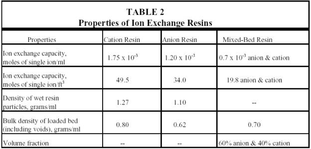 The physical arrangement of one type of ion exchange vessel for purifying water is shown in Figure 3. The ion exchange resin is contained in a vessel with a volume of several cubic feet. Retention elements at the top and bottom consist of screens, slotted cylinders, or other suitable devices with openings smaller than the resin beads to prevent the resin from escaping from the vessel. The resin bed is a uniform mixture of cation and anion resins in a volume ratio of 2 parts cation resin to 3 parts anion resin. This arrangement is called a mixed-bed resin, as opposed to an arrangement of cation and anion resins in discrete layers or separate vessels. The use of different volumes of the two types of resins is due to the difference in exchange capacity between cation and anion resins. Exchange capacity is the amount of impurity that a given amount of resin is capable of removing, and it has units of moles/ml, equivalents/ml, or moles/gm. The anion resin is less dense than the cation resin; thus, it has a smaller exchange capacity, and a larger volume is needed for anion resins than for the cation resins to obtain equal total exchange capabilities.