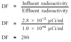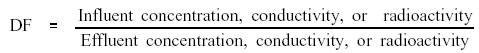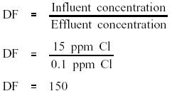 Example 1: An ion exchanger influent contains 15 ppm chloride (Cl). Effluent chloride is measured at 0.1 ppm. What is the DF of this ion exchanger? Solution: