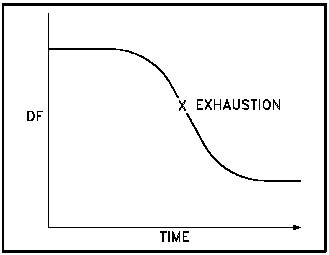 Resin performance may be monitored using a history curve that plots DF with respect to time. A typical history curve is shown in Figure 4, with the resin considered "exhausted" at point X.