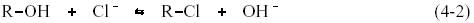 In most practical situations, a solution containing impurities at low concentrations is passed through a large amount of resin. By LeChatelier's Principle, the equilibrium of Reaction (4-1) is forced far to the right. The equilibrium is displaced so far that, for practical purposes, all Na' ions are removed from solution and replaced by H+ ions. As a result, the solution will be acidic because of the excess of H+ ions. If a solution containing Cl- ions is passed through hydroxyl resin, the Cl- ions will be removed according to the following reaction.