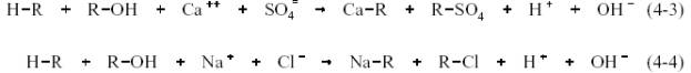 In the reaction with NaCl, both Na+ and Cl- ions are removed from solution and replaced by H+ and OR ions, respectively (the CaS04 reaction has the same result). If the initial solution contained only NaCl, then the concentrations of Na+ and Cl- ions were equal. Because both are removed with 100 percent efficiency, the concentrations of H+ and OH ions added to the solution are equal; thus, the solution is neutral. In solution, H+ and OH- ions must obey the relationship for the ionization of water (refer to Module 1).