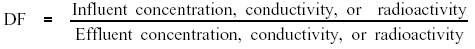 charge. Common anions include Decontamination factor (DF) is a ratio of the concentration (or activity) of the fluid at the inlet compared to the concentration (or activity) at the effluent, which defines the effectiveness of the ion exchange process. Mathematically it is: