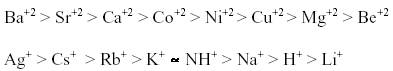 Polymers are extremely large molecules that are formed by the combination of many molecules of one or two compounds in a repeating structure that produces long chains. Affinity is often used to describe the attraction between a resin and a given ion. This affinity can be described quantitatively by experimental determination of a parameter called the relative affinity coefficient. Resin beads are long-chain cross-linked polymers that contain sites occupied by exchangeable ions. The general order of affinity serves as a useful guide in understanding many ion exchange processes. Cation and anion resins are named according to the identity of the ion occupying the exchange sites, such as hydrogen, hydroxyl, and chloride. Mixed-bed resins are used to remove both cations and anions. The effectiveness of any ion exchanger is directly related to the relative affinities between a resin and different ions. In order of decreasing strength, the relative affinities between a cation resin and various cations are: