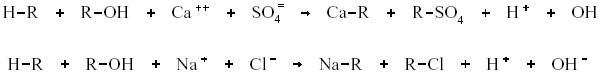 The higher the relative affinity the more effective the ion exchanger. This effectiveness is expressed by the Decontamination Factor. The reaction for removal of NaCl and CaS04 by a mixed-bed ion exchanger such as one containing HOH resin is as follows: