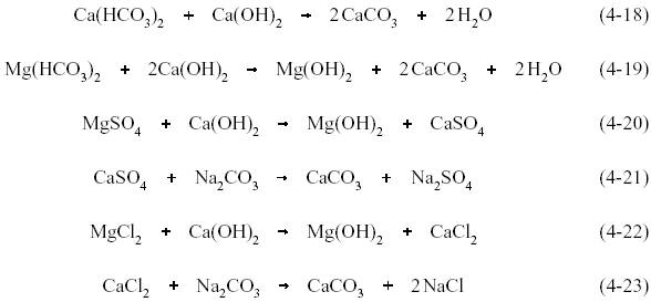Referring back to Figure 5 and examining the effluent of the softener, we find that both sodium salts and precipitates are present. These substances result from reactions that typically occur based on the presence of Ca++ and Mg++ salts. The chemicals most commonly used for softening are soda ash or sodium carbonate (Na2CO3) and hydrated lime (Ca(OH2)). Hard water (water containing Ca++ and Mg++ salts) contains calcium and magnesium bicarbonates (Ca(HC03)2) and (Mg(HC03)2), as well as calcium sulfate (CaSO4) and magnesium chloride (MgCI2). These impurities produce the following reactions.