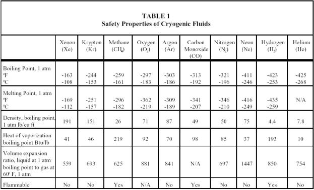 Liquids Most cryogenic liquids are colorless, odorless, and tasteless when vaporized to a gas. As liquids, most have no color (except liquid oxygen which is light blue). However, whenever the cold liquid and vapor are exposed to the atmosphere a warning appears. As the boil-off gases condense moisture in the air, a fog forms that extends over an area larger than the vaporizing gas. Many cryogenic liquids are inert gases, and may inert an enclosed space. Inert gases will not support life. Both the liquid and its boil-off vapor can rapidly freeze human tissue and can cause many common materials such as carbon steel, plastic, and rubber to become brittle or fracture under stress. Liquids in containers and piping at temperatures at or below the boiling point of liquified air (-318F) can cause the surrounding air to condense to a liquid. Extremely cold liquified gases (helium, hydrogen, and neon) can even solidify air or other gases to which they are directly exposed. In some cases, plugs of ice or foreign material will develop in cryogenic container vents and openings and cause the vessel to rupture. If a plug forms, contact the supplier immediately. Do not attempt to remove the plug; move the vessel to a remote location. All cryogenic liquids produce large volumes of gas when they vaporize. For example, 1 volume of saturated liquid nitrogen at 1 atmosphere vaporizes to 696.5 volumes of nitrogen gas at room temperature at 1 atmosphere. When vaporized in a sealed container, cryogenic liquids produce enormous pressures. If 1 volume of liquid helium at 1 atmosphere is warmed to room temperature and vaporized in a totally enclosed container, it has the potential to generate a pressure of more than 14,500 psig. Because of this high pressure, cryogenic containers are usually protected with two pressure-relief devices, a pressure-relief valve and a frangible (easily broken) disk. Many safety precautions that must be taken with compressed gases also apply to liquified gases. However, some additional precautions are necessary because of the special properties exhibited by fluids at cryogenic temperatures. The properties of cryogenic liquids affect their safe handling and use. Table 1 presents information to help determine safe handling procedures. None of the gases listed are corrosive at ambient temperatures, and only carbon monoxide is toxic. Always handle cryogenic liquids carefully. They can cause frostbite on skin and exposed eye tissue. When spilled, they tend to spread, covering a surface completely and cooling a large area. The vapors emitted by these liquids are also extremely cold and can damage tissues. The vapor boil-off may inert the immediate vicinity. Stand clear of boiling or splashing liquid and its vapors. Boiling and splashing occurs when a warm container is charged or when warm objects are inserted into a liquid. These operations should always be performed slowly to minimize boiling and splashing. If cold liquid or vapor comes in contact with the skin or eyes, first aid should be given immediately. Never allow an unprotected part of the body to touch uninsulated pipes or vessels that contain cryogenic fluids. The extremely cold metal will cause the flesh to stick fast to the surface and tear when withdrawn. Touching even nonmetallic materials at low temperatures is dangerous. Tongs, or a similar device, should be used to withdraw objects immersed in a cryogenic liquid. Materials that are soft and pliable at room temperature become hard and brittle at extremely low temperatures and will break easily. Workers handling cryogenic liquids should use eye and hand protection to protect against splashing and cold-contact burns. Safety glasses are also recommended. If severe spraying or splashing is likely, a face shield or chemical goggles should be worn. Protective gloves should always be worn when anything that comes in contact with cold liquids and their vapors is being handled. Gloves should be loose fitting so that they can be removed quickly if liquids are spilled into them. Trousers should remain outside of boots or work shoes.