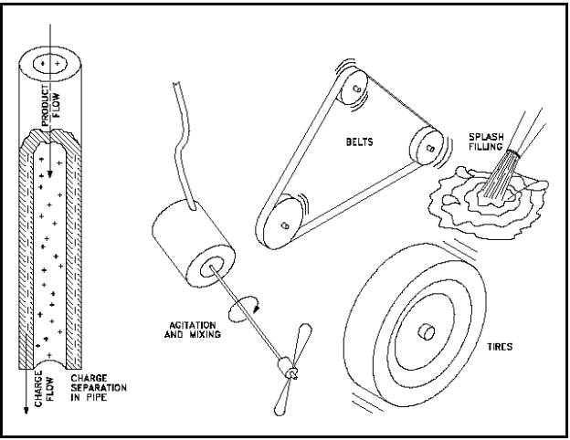 Avoid accidental mixture of flammable and combustible liquids. A small amount of a highly volatile substance may lower the flash point of a less volatile substance and form a more flammable mixture. In addition, the lower flash point liquid can act as a fuse to ignite the higher flash point material in the same manner as if it were a flammable mixture. Fill and discharge lines and openings, as well as control valves associated with flammable and combustible systems, shall be identified by labels, color coding, or both, to prevent mixing different substances. All storage tanks shall be clearly labeled with the name of its contents, and products stored within shall not be intermixed. Transfer lines from different types and classes of flammable products should be kept separate, and preferably, different pumps should be provided for individual products. For handling quantities of flammable liquids up to five gallons, a portable FM (Factory Mutual Engineering Corp.) or UL (Underwriters Laboratory) approved container should be used. The container should be clearly identified by lettering or color code. Smoking, the carrying of strike-anywhere matches, lighters, and other spark-producing devices should not be permitted in a building or area where flammable liquids are stored, handled, or used. The extent of the restricted area will depend on the type of products handled, the design of the building, local codes, and local conditions. Suitable NO SMOKING signs should be posted conspicuously in those buildings and areas where smoking is prohibited. Static electricity is generated by the contact and separation of dissimilar material. For example, static electricity is generated when a fluid flows through a pipe or from an orifice into a tank. Examples of several methods of generating static electricity are shown in Figure 5. The principal hazards created by static electricity are fire and explosion, which are caused by spark discharges. A point of great danger from a static spark is where a flammable vapor is present in the air, such as the outlet of a flammable liquid fill pipe, at a delivery hose nozzle, near an open flammable liquid container, and around a tank truck fill opening. In the presence of a mechanism for generating a static charge, a spark between two bodies occurs when there is a poor electrical conductive path between them. Hence, grounding or bonding of flammable liquid containers is necessary to prevent static electricity from causing a spark.