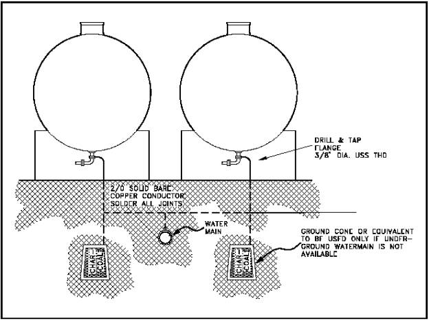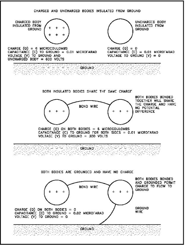 Figure 6 Bonding and Grounding To avoid a spark from discharge of static electricity during flammable liquid filling operations, a wire bond should be provided between the storage container and the container being filled, unless a metallic path between the container is otherwise present. Above-ground tanks used for storage of flammable liquids do not have to be grounded unless they are on concrete or on nonconductive supports. Ground wires should be uninsulated so they may be easily inspected for mechanical damage and should never be painted. Figure 7 illustrates grounding above-ground storage tanks.