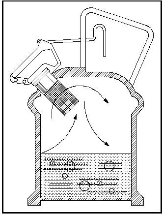 Class I and Class II liquids should not be kept or stored in a building except in approved containers, as illustrated in Figure 9, within either a storage cabinet or a storage room that does not have an opening that communicates with the public portion of the building. The spring-loaded cover is designed to open in order to relieve internal vapor pressure. Quantities stored in such locations should be limited. They should not be stored so as to limit use of exits, stairways, or areas normally used for the safe egress of people. Neither should they be stored close to stoves or heated pipes, nor exposed to the rays of the sun or other sources of heat. Losses by evaporation of liquid stored in safety cans at ordinary temperatures are negligible. Storage of flammable and combustible liquids in open containers should not be permitted. Approved containers for flammable liquids should be closed after each use and when empty. Warning labels should be removed from flammable liquid containers when empty (vapor free). Bulk Class I liquids should be stored in an underground (buried) tank or outside a building. No outlet from the tank should be inside a building unless it terminates in a special room, as illustrated in Figure 10.
