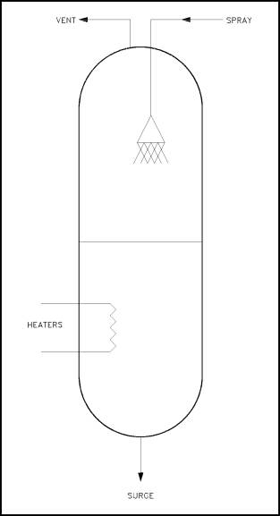 Figure 3 Pressurizer Reduction of total gas concentrations in PWRs is normally accomplished by the venting of a steam space. In those facilities utilizing a pressurizer, the steam space in the top of the pressurizer is designed to accomplish this venting operation either continuously or intermittently. This process of reducing the total gas concentration is generally referred to as degassification. A typical PWR pressurizer with degassification piping is shown in Figure 3. Degassification is not normally required in a BWR because of its design. As discussed previously, the boiling action in the reactor vessel strips dissolved gases from the water, and they are continuously removed in the condensing phase of the energy cycle.