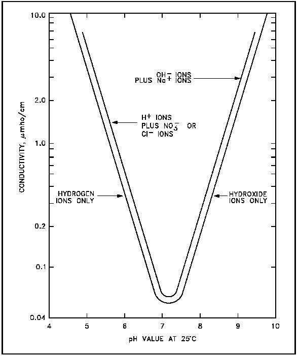 Conductivity of reactor facility water is measured to provide an indication of dissolved ionic substances in the coolant. Conductivity measurements provide quantitative rather than qualitative information because it is possible to determine the total conductivity of the ions present, but not the specific types of ions present. Because many ions such as iron (Fe +++), chromium (Cr+++), copper (Cu++) and aluminum (Al +++) are susceptible to forming oxides and plating out as scale on heat transfer surfaces, reactor coolant conductivity is normally controlled at a level as low as practicable and consistent with pH. By monitoring conductivity levels in the reactor facility systems, the operator is able to cross check the chemistry of these systems, thereby achieving a higher confidence level in the parameters measured. Regardless of the operating limits specified for a given reactor facility, operating relationships can be established between pH and conductivity levels of the coolant. Figure 4 shows a typical relationship of the pH and conductivity of a reactor coolant system using high pH, ammonium hydroxide chemistry control as a function of the ammonia (NH3) concentration.