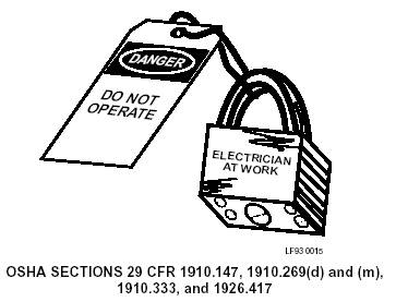 Figure 2-6. Employers shall implement and document a lockout-tagout program with procedures to safeguard employees from injury while working on or near deenergized systems. exists as a result of induced voltage or voltage backfeed after specific parts of the circuit have been deenergized. If the circuit to be tested is over 600 V nominal, the test equipment shall be checked for proper operation immediately before and immediately after this test. This test is also recommended for systems of 600 V or less. Testing shall be performed as if the circuit is energized. The voltage verification device used shall be rated for the application. Proximity testers and solenoid-type devices should not be used to test for the absence of AC voltage. See 2.13.4.7 for further information. 2.13.2.2 APPLICATION OF GROUNDS Personnel protective grounds shall be applied on circuits 600 V and above or on lesser voltages where residual charges may accumulate. Personal protective grounds shall be selected and installed in accordance with appropriate standards. (See sections 4.6 and 7.5). Consideration shall be given to step and touch potentials in the area of the temporary ground connections. 2.13.3 REENERGIZING EQUIPMENT The following requirements shall be met before circuits or equipment are reenergized, even temporarily. Reference 29 CFR 1910.147,1910.269,1910.333 and 1926.417 for detailed information. 2.13.3.1 TESTS AND VISUAL INSPECTIONS A qualified worker shall conduct tests and visual inspections to verify that all personnel are in the clear and that all tools, electrical jumpers, shorts, grounds, and other such devices have been removed so that the circuits and equipment can be safely energized. 2.13.3.2 WARNING EMPLOYEES Employees exposed to the hazards associated with reenergizing the circuit or equipment shall be warned to stay clear of circuits and equipment. 2.13.3.3 REMOVING LOCK AND TAG Each lock and tag shall be removed by applying the following: 1. Each lockout or tagout device shall be removed from each energy-isolating device by the authorized employee who applied the lockout or tagout device, or under their direct supervision, or as stated below. 2. Exception: When the authorized employee who applied the lockout or tagout device is not available to remove it, that device maybe removed under the direction of his or her supervisor. Extreme care shall be taken and specific procedures shall be followed. The specific procedure shall include at least the following elements: a. Verification by the supervisor that the authorized employee who applied the device is not at the affected facility b. Making all reasonable efforts to contact the authorized employee to inform him or her that the lockout or tagout device has been removed c. Ensuring that the authorized employee has this knowledge before he or she resumes work at the affected facility. 2.13.4 SAFE ENERGIZED WORK (HOT WORK) Safety-related work practices shall be used to prevent electrical shock or other electrically induced injuries when employees work on or near electrical conductors or circuit parts that are energized. Only qualified workers who are knowledgeable and have been trained to work safely on energized circuits and to use the appropriate PPE, protective clothing, insulating shielding materials, and insulated tools shall be permitted to work on energized conductors or circuit parts.