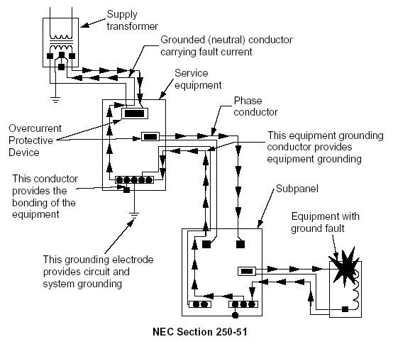 Figure 4-1. Circuit and system grounding consists of earth grounding the electrical system at the supply transformer and the line side of the service equipment. Equipment grounding and bonding is accomplished by connecting all metal enclosures and raceways together with the grounding conductors.